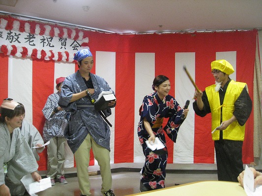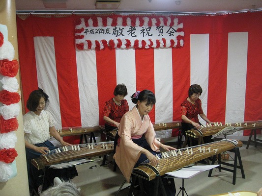式典ではご来賓の方々にお祝いのお言葉をいただき、ご長寿の表彰をさせて頂きました。また、余興では琴の演奏に併せて歌を歌ったり、職員の劇を楽しまれたりと、皆様で和やかな時間を過ごすことが出来ました。