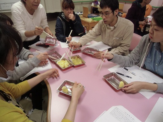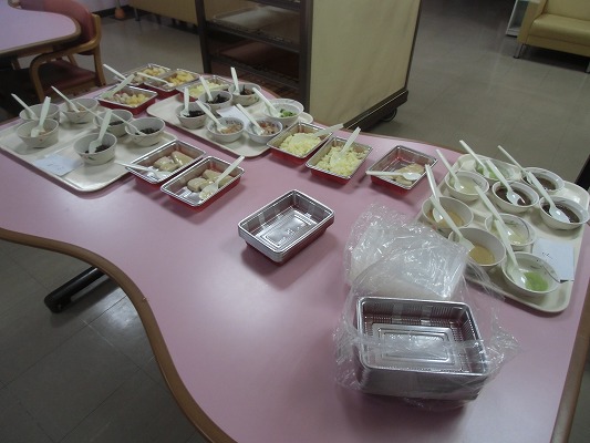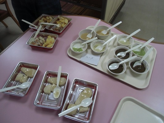 今回は、食事形態による咀嚼や嚥下の変化を身をもって体験しようとの内容で勉強会をしました。