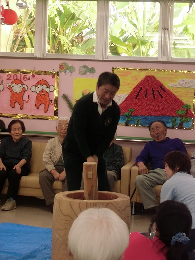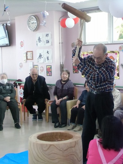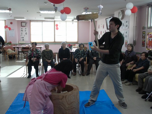 「まだまだ若いものには・・・」という感じでしょうか?ご利用者様も「もちつき」に参加して下さり、女性陣からは「ヨイショっ!」のかけ声。