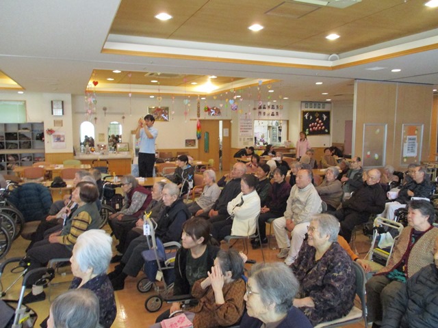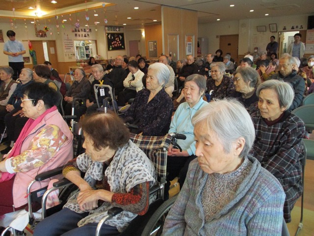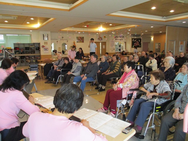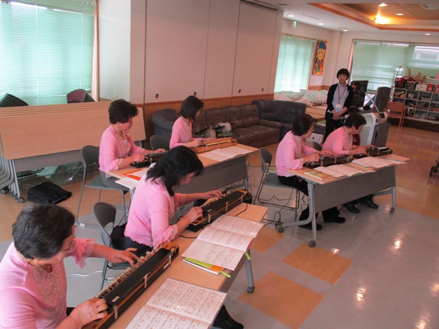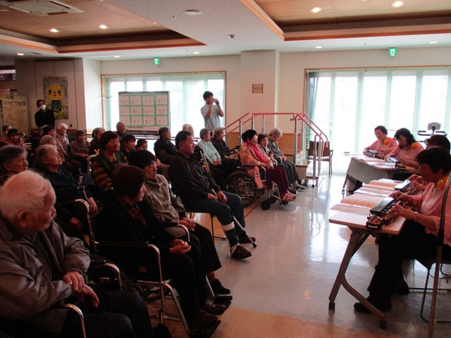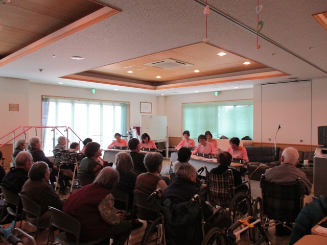 今日は、大正琴のボランティアの皆様が来園して下さり素敵な演奏をして下さいました。入居者の皆様も昔懐かしい音色を聴き、思わず口ずさんだり自然と笑顔になったりと、とても有意義な時間を過ごせていたように思えます。また、来てくださるようお待ちしています。ありがとうございました。
