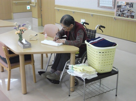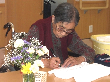 そんな中、あるご入居者様が「私でよければ名前を書きましょうか?」と声をかけて下さったのです!素敵なご好意に感動しながらも、せっかくですのでお願いしました。1枚1枚に丁寧に名前を書かれる姿に思わずシャッターを切りました。