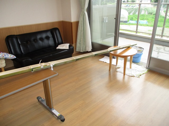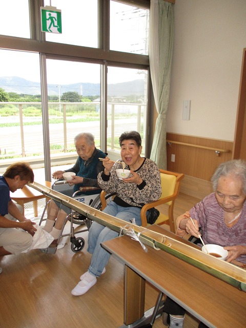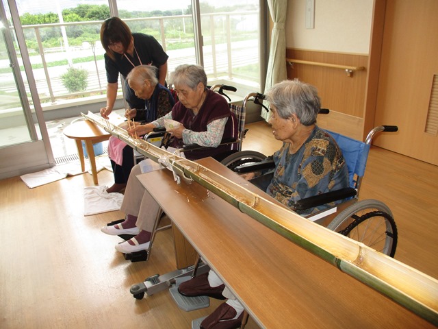毎年入居者様から大好評の流しそうめん。今年も実施致しました!ユニットリーダーが自宅から立派な竹をもってきて、流しそうめんセットの完成~!