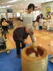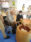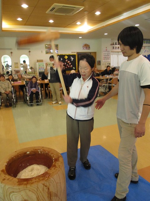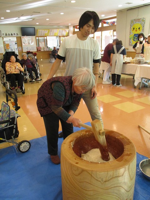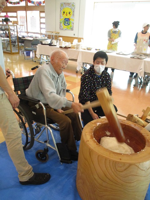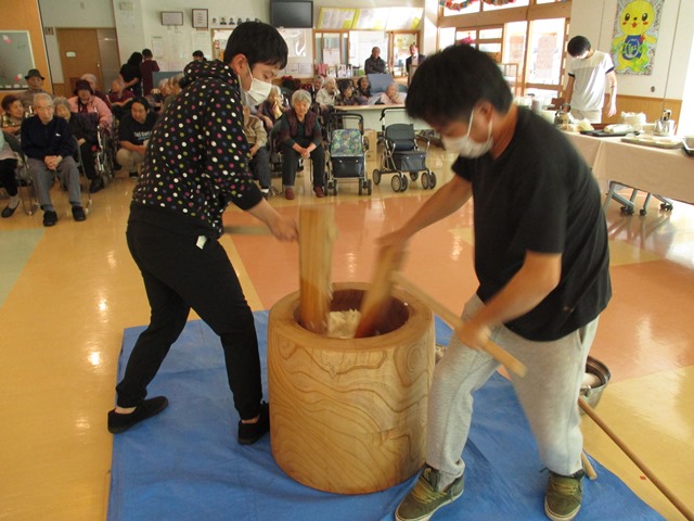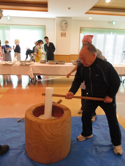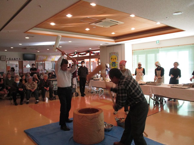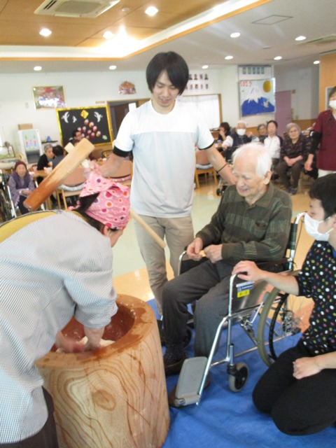 12/28 デイサービス、特養、ショートステイ合同もちつき会が盛大に実施されました!職員がもちつきをすると、「そうじゃないだろ」「こうやるんだ」と利用者様からのご指導を賜り、皆で笑顔!利用者も一緒になってもちつきをすることとなりました!つきたてのお餅、とてもおいしかったです。