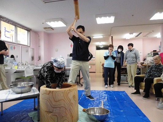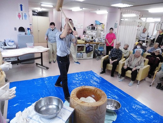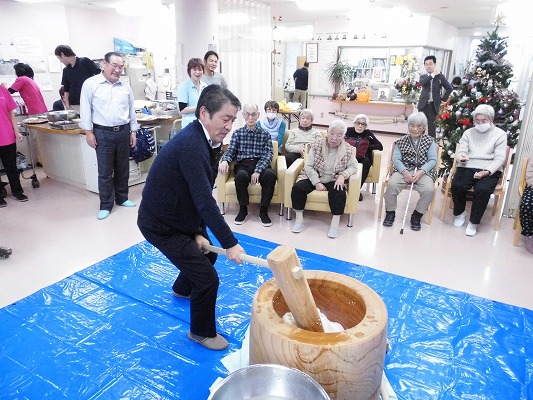 今年を締めくくる餅つきが、12月26日に行われました。デイサービスのご利用者様にもお手伝いをしていただき、