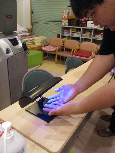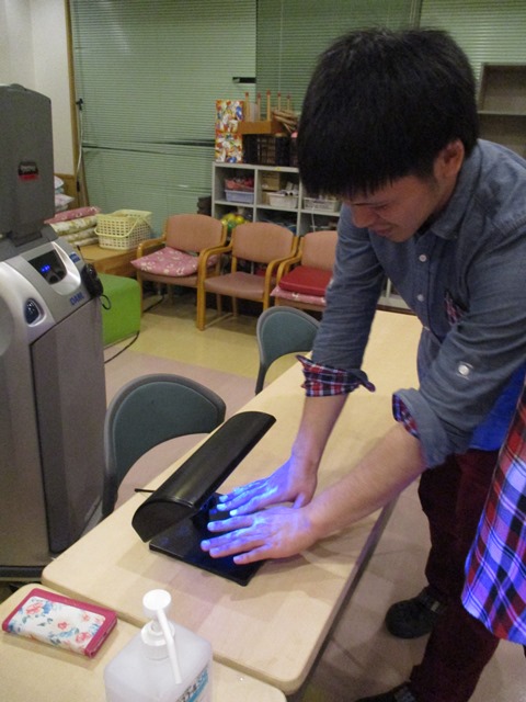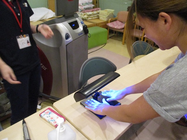 今日から6月。入梅の季節となりました☂ジメジメした時期に怖いのが食中毒。ということで、今日は管理栄養士講師による、食中毒の勉強会を行いました。看護介護の基本は”一動作一手洗い”と言われるほど、正しい方法での手洗いがとても重要です。今回は手洗いチェッカーといわれる機材を使用し、洗い残しがないかを自己確認することができました。