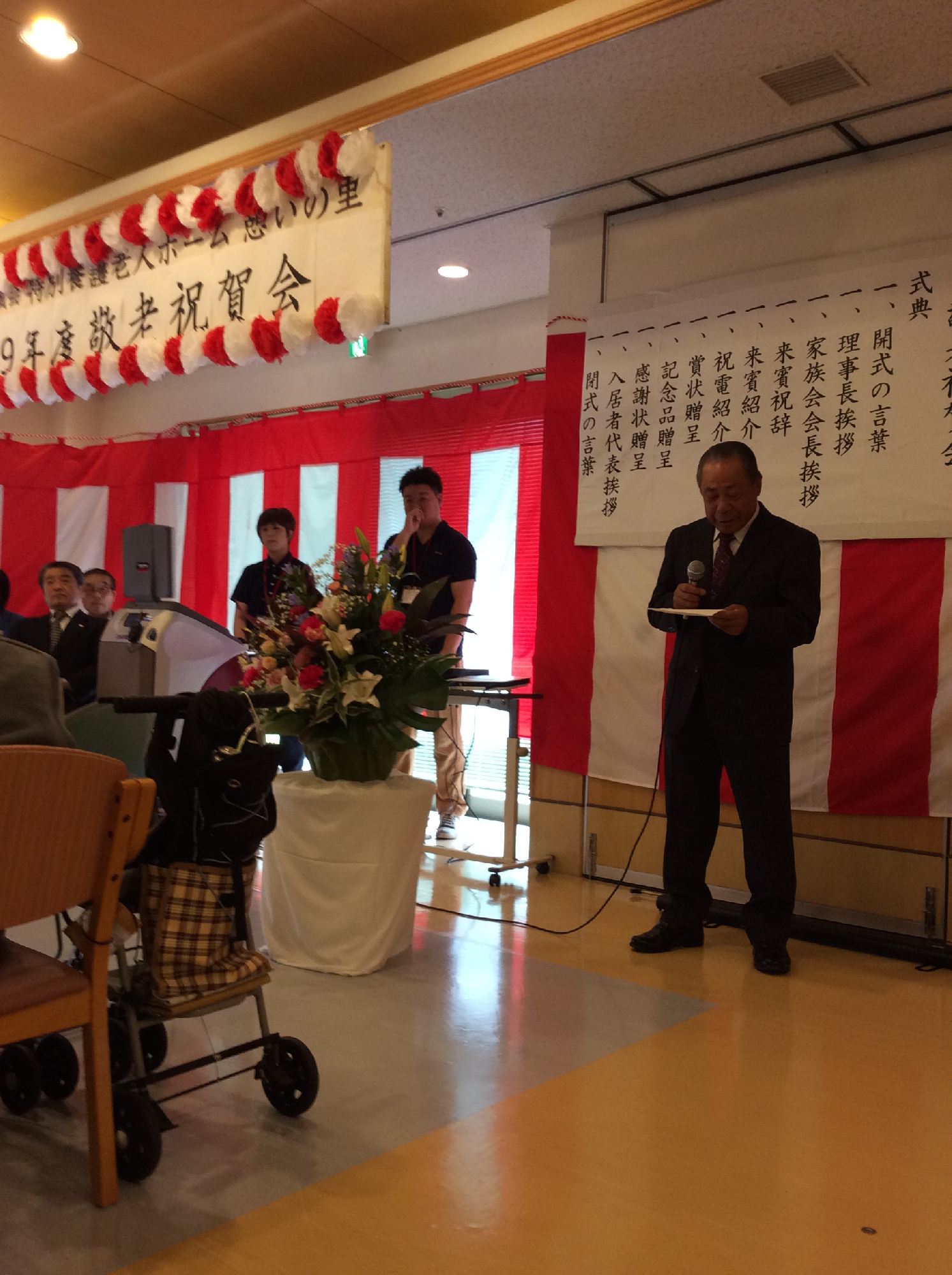 あいにくの天候にもかかわらず、多くの方々にご来園頂き、盛大に敬老祝賀会を開催することができました。また、たくさんの祝電を頂き、誠にありがとうございました。憩いの里最高齢は、100歳!白寿の方が2名いらっしゃいました。とてもお元気で、賞状をお渡しする際「ありがとうございます」と涙を流す方もいらっしゃいました。