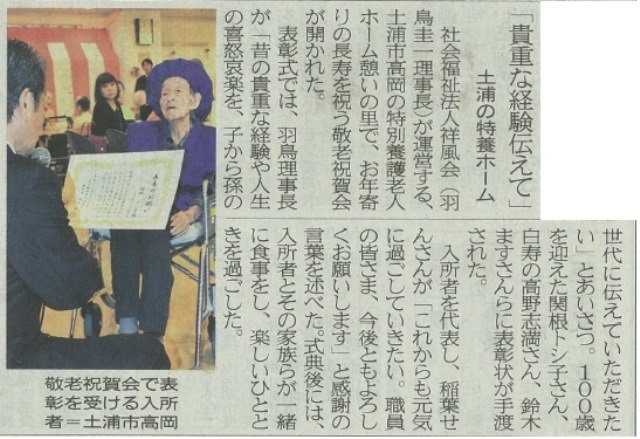 9月17日に行われました憩いの里敬老祝賀会について、9月26日の茨城新聞に掲載されました!
