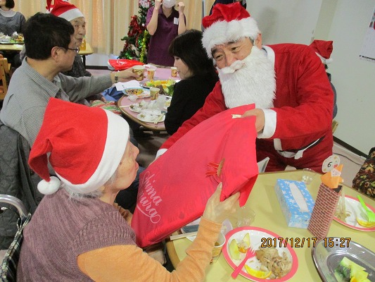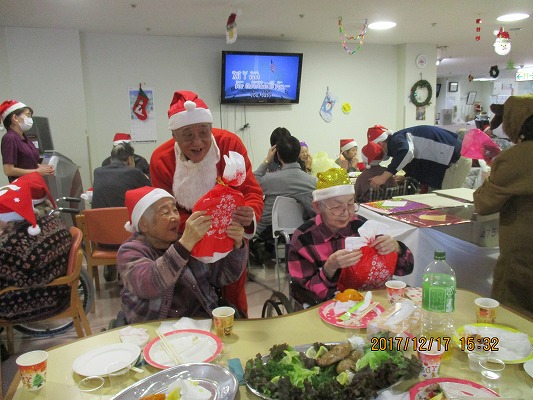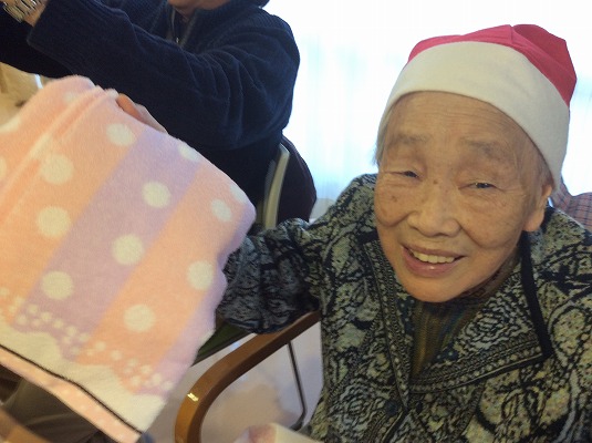 どちらにもサンタ&トナカイが登場し、ご利用者の皆様一人一人に素敵なプレゼントが贈られました。プレゼントを開けながら、「かわいい!」や「好きな色だわ♪」と感想を聞くことができ、職員もほっこり嬉しい気持ちを頂きました(^^)