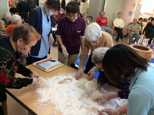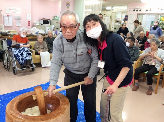 ご利用されている皆様と職員合同で餅をつき鏡餅を作りました。皆様のご協力で「よいしょー!よいしょー!」と活気あふれる行事となりました。