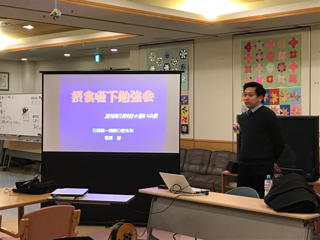 本日、憩いの里で施設内勉強会を実施致しました。今回は石岡第一病院歯科口腔外科医、福澤智先生による「摂食嚥下勉強会」でした。
