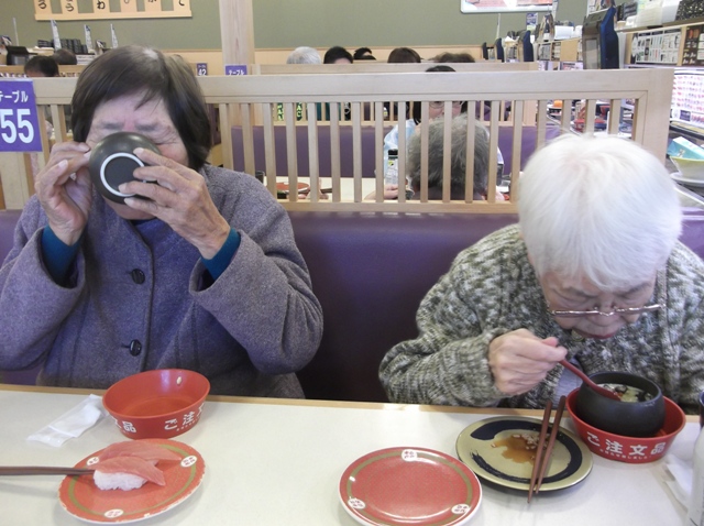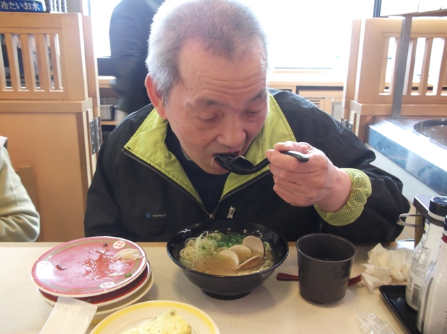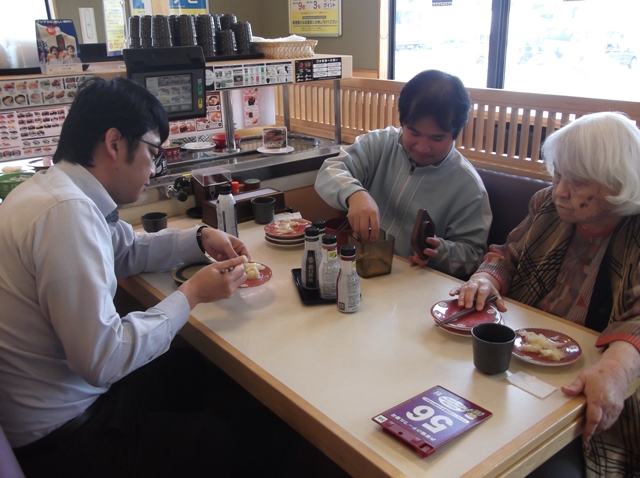 3月の外出行事は皆様待望の外食会!デイサービスの食事も美味しいのですが、たまには気分を変えてお寿司屋さんへ!みなさん最初は遠慮がちでしたが、時間が経つにつれ各々好きな寿司や茶わん蒸し、うどんなどを頼まれていました。とても満足されたようで、また来ることを約束して外食会の幕は閉じました!