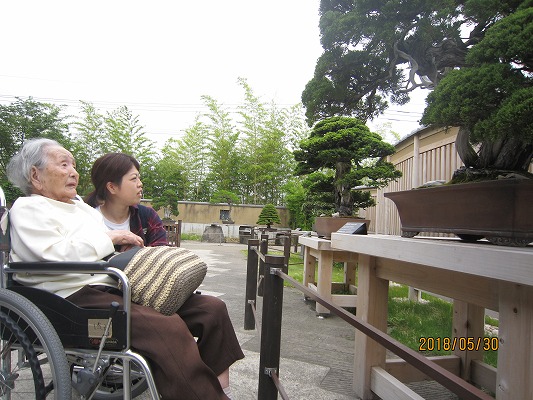 そして昼食後には盆栽美術館に行き、どの盆栽も樹齢百年以上で「立派だね~、全部の樹が年上だね。」と利用者様も驚かれてました。