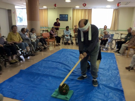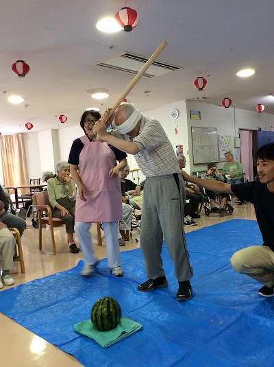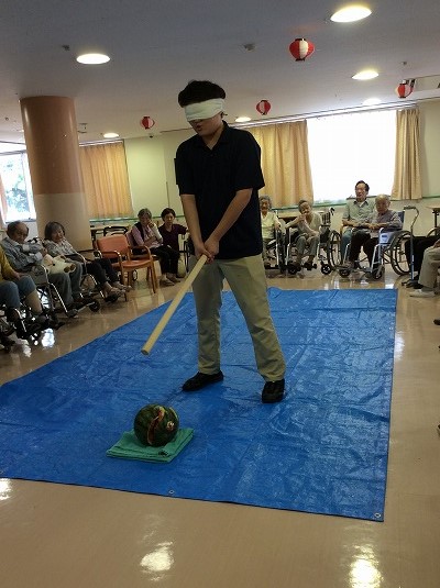 わいわい賑やかに「右右!」「もう少し前!」「そこだ!」と声が飛び交いましたが、なかなか割れず・・・(^^;)職員も参加し、なんとか計2個のスイカを割ることに成功しました!