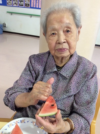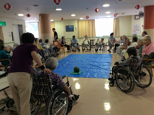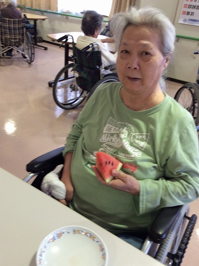 終了後のおやつも、もちろんスイカ♪水分補給にうってつけですね♪スイカ割りのおかげでホールにはあまい匂いが広がっており、視覚・嗅覚で食欲を刺激されていた皆様☆ぺろりと平らげてくださいました(^^)