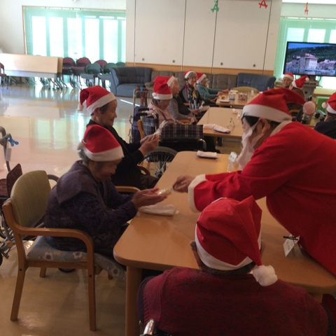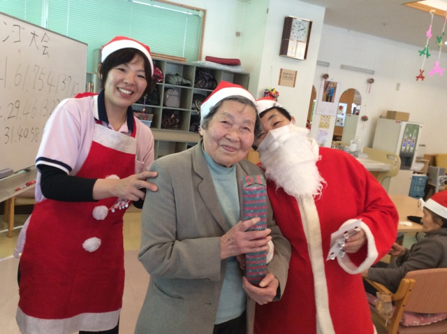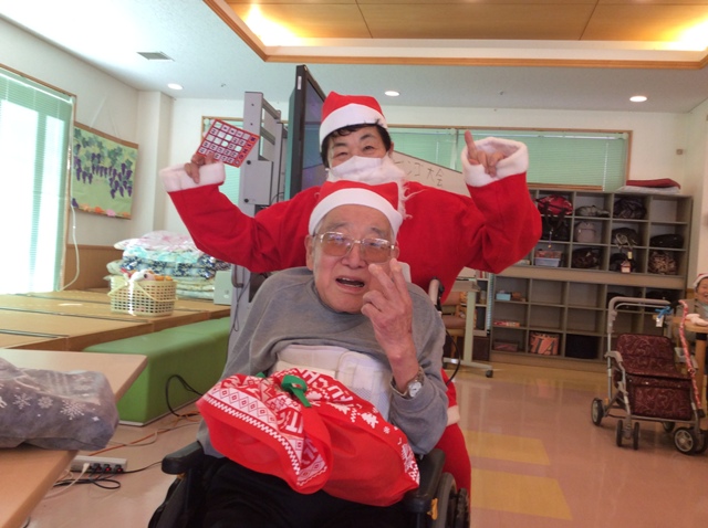 デイサービスでは毎年恒例となりました「クリスマス会&忘年会パーティ」を2日間かけて行ないました。皆様、サンタと笑顔で写真撮影したり、プレゼントをお渡ししました!午後からはビンゴゲーム大会!!今年の景品は、マッサージクッションやひざ掛け、ハンドタオルなどご用意させていただき、大変盛り上がりました!