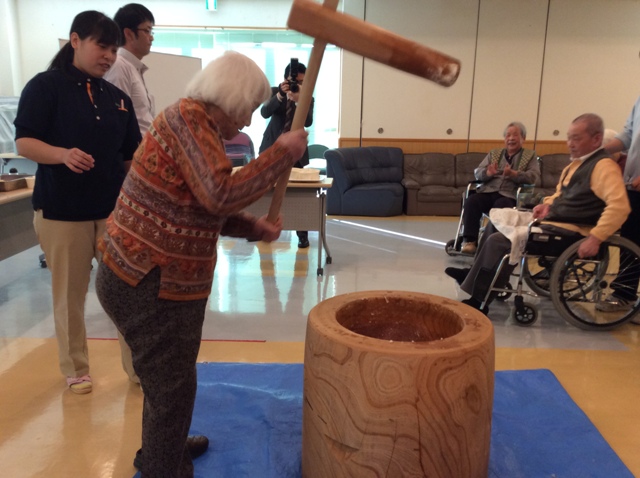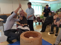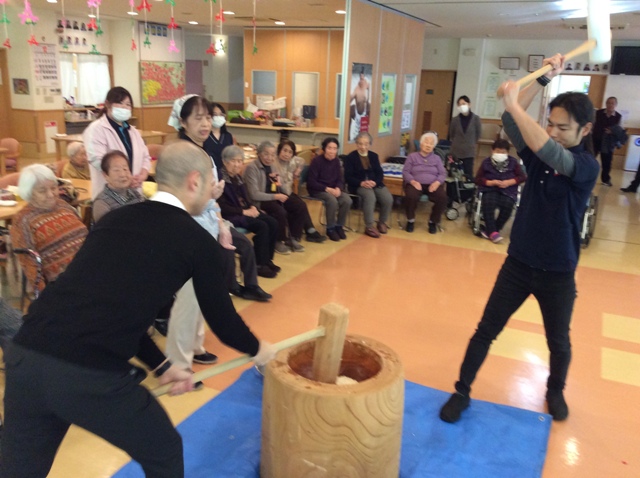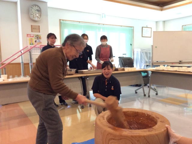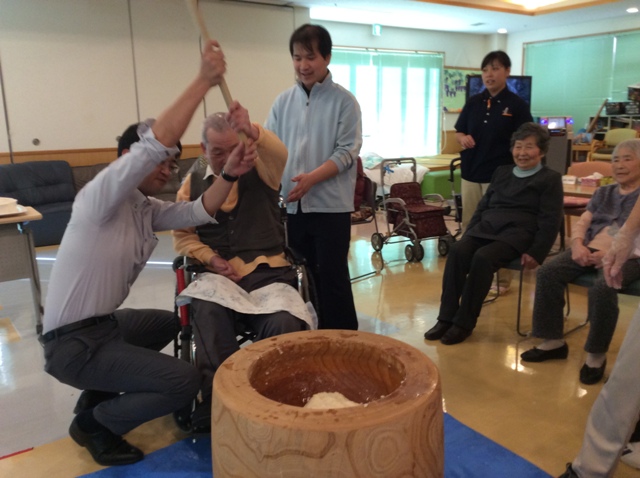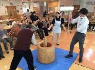 今年も憩いの里では餅つき大会が行なわれました。利用者様も杵を持ち、力強く餅をついておりました!皆様についていただいたお陰でもっちりとした美味しいお餅が出来上がりました!味はあんこときなこで召し上がっていただき、利用者様から「つきたての餅は美味しいね」と好評でした!!