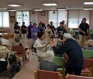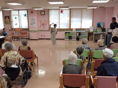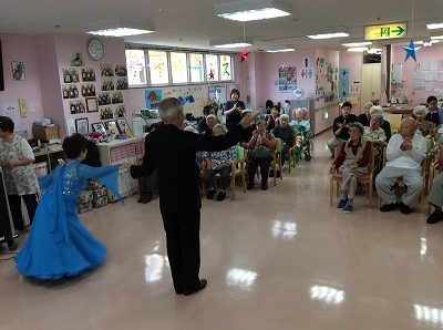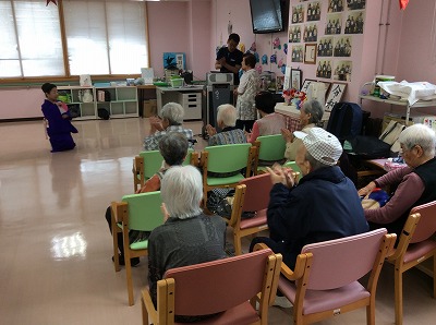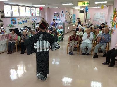 日本舞踊からドジョウすくい、ワルツなど様々な踊りを披露してくださいました。終始体を動かして楽しまれている利用者もおりました。最後には「だんなさま」の曲に合わせて職員も一緒に踊りました。利用者、職員ともに楽しませていただきました。