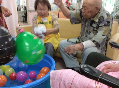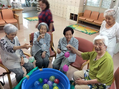 合間では、カラオケ、ゲーム、ヨーヨーすくいをしてにぎやかに過ごしました。そして、最後のお楽しみビンゴ大会です。「やったー!」や「まだ駄目だー!」など様々な声が聞かれ、にぎやかな時間を過ごされました。