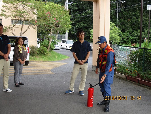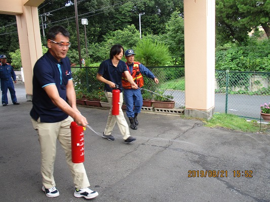立会いのほかに通報訓練と水消化器を使った消火訓練を実施しました。