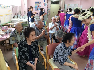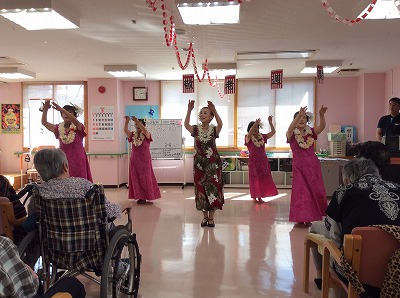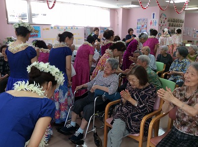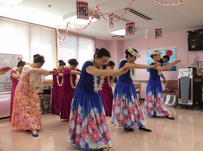 聞きなれない言葉ですがフラダンスを披露してくださるボランティアです。本日はアンコール含め全10曲の内容でした。なんと18名のダンサーが来て下さりました!!