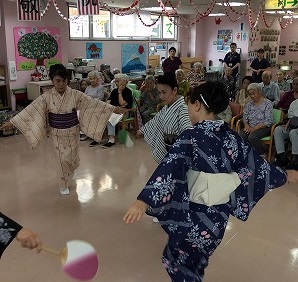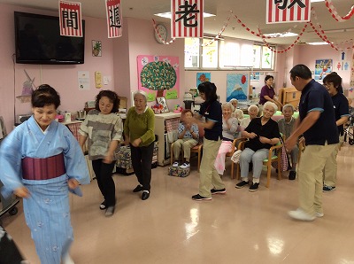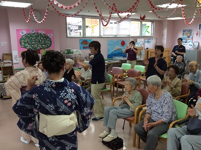 本日は、日本舞踊を披露してくださる『小鈴会』様をお招きいたしました。特養行事の納涼祭に続き、デイサービスの依頼も快く引き受けてくださいました。「東京音頭」「炭坑節」「騎乗踊り」「男の意地」などなど、傘を使うものありました。色鮮やかな衣装でみんなでうっとり。見とれてしまいました。最後には、ご利用者、職員も参加して炭坑節を踊ってにぎやかに過ごすことが出来ました。