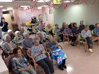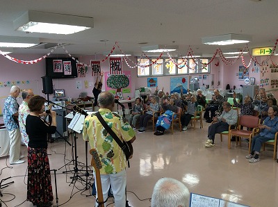 昭和歌謡曲の「東京キッド」や「東京の人」、「水色のワルツ」、「誰よりも君を愛す」など、多くの曲を披露してくださいました。中にはタンゴの「小雨降る町」もありました。手拍子をしながら口ずさんだり、昔を思い出して涙を流す方もいました。