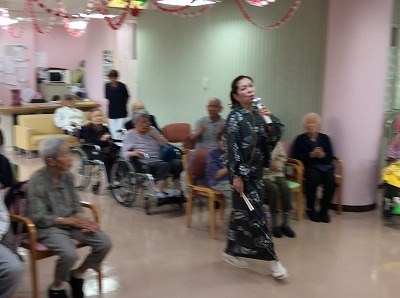 本日のメンバーは4名。ギターの生演奏や歌謡曲、軍歌を歌っていただきました。一曲ごとに曲に合わせ衣装をチェンジし、見ても聞いても楽しめるものでした。後半には、戦争中の特攻隊の手紙の読み上げで、涙を浮かべる方もいらっしゃいました。