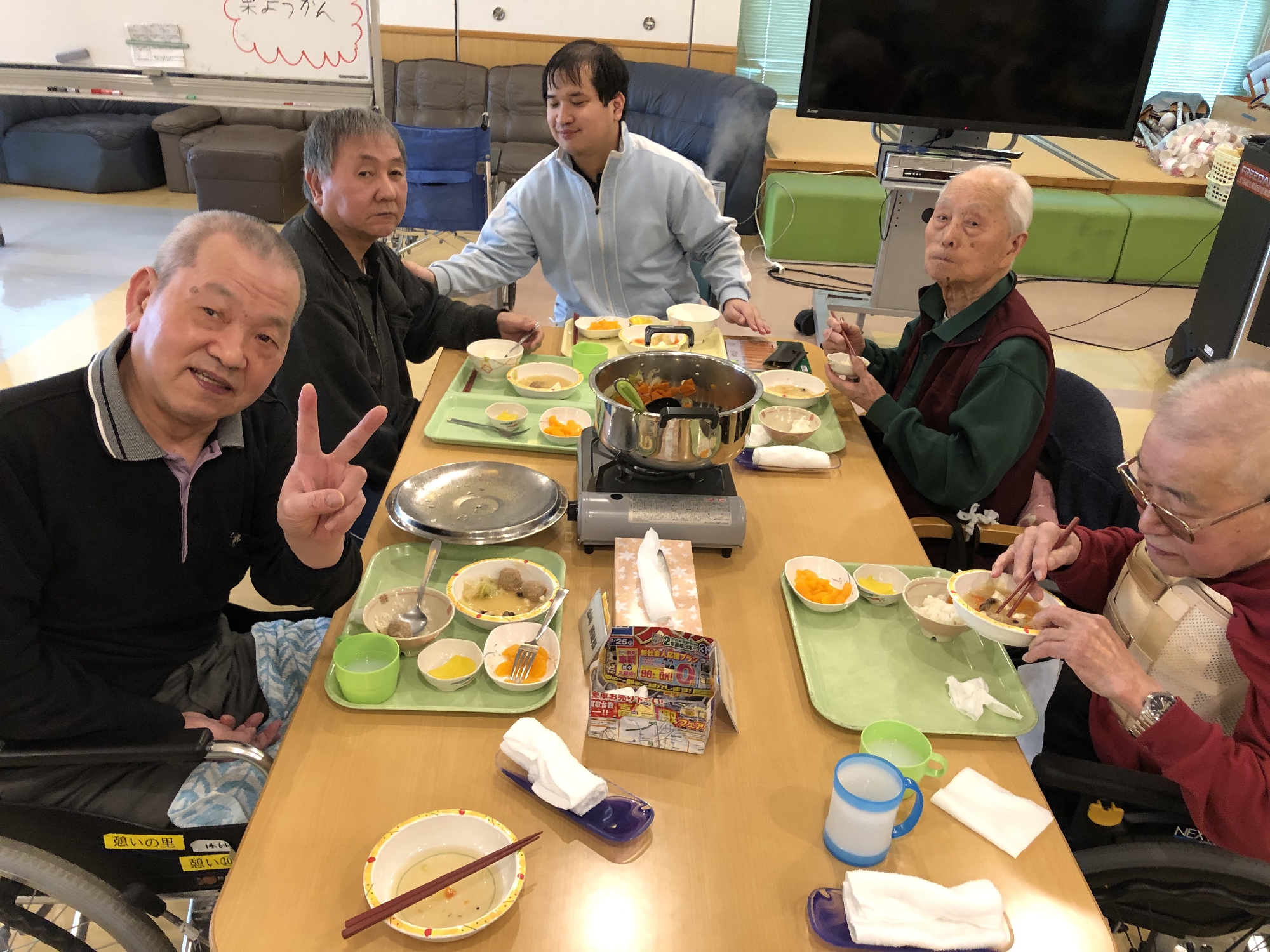 12月26日は忘年会を開催いたしました。忘年会は鍋とジュースで会食からスタート。クリスマス同様ビンゴ大会も盛り上がり、ご利用者様の楽しそうな笑顔を見る事ができました。
