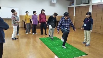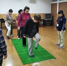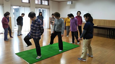2/15(土曜日)土浦市中高津のさつき会様からのご依頼で、介護予防教室を開催させていただきました。本日の内容は、スクエアステップです。マスが書かれたマットの上でテンポよく足踏みをしながら進んで行きます。前半は簡単ですが、後半になるにつれ次第に難しくなります。皆様真剣に取り組むことが出来ました。