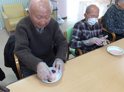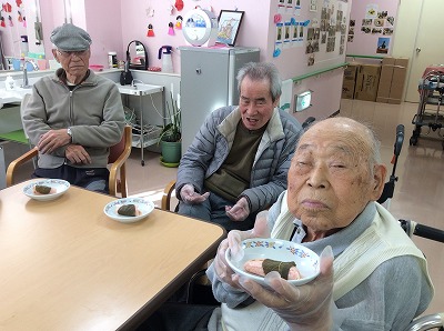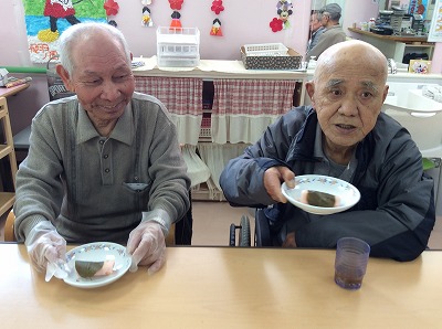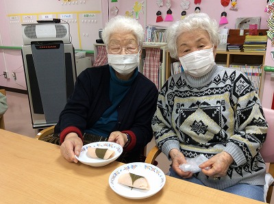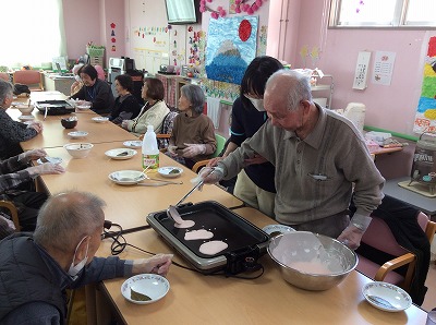 3月の行事は、桜餅作りです♪生地をホットプレートに流して、ひっくり返して…。みんなで協力してつくりました。あんこを入れて桜の葉で丸めて出来上がりっ!「生地がもちもちで美味しい!」と言っていただきました。また、「ありがとねー。」の歌をうたってくださり、にぎやかに過ごしました♬