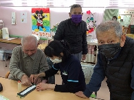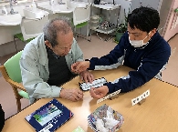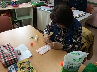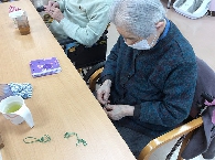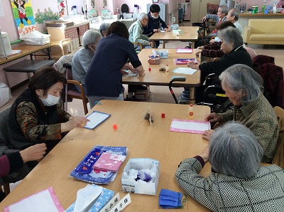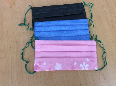 好きな色の花紙を外側とし、内側はキッチンペーパー、耳のゴムはなんと輪ゴムです!縫い付けるのはちょっと難しいので、ノリで貼り付けて出来上がり♬ほとんどのご利用者が自分で作ることが出来、早くもその日の帰りに着けて帰る方もおりました♪
