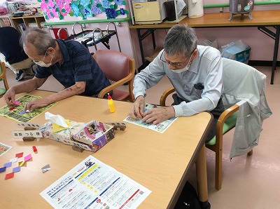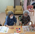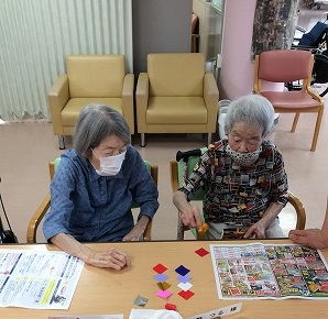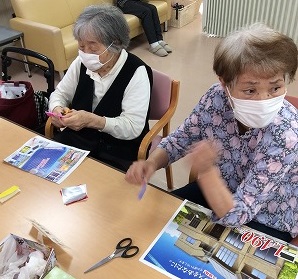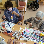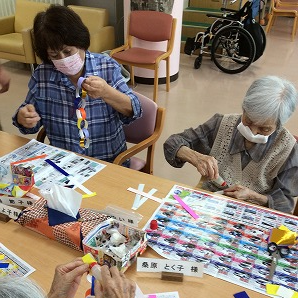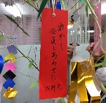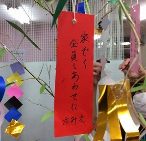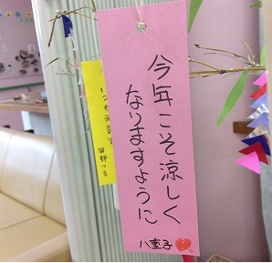7月デイサービスのなかを、ご近所様から笹をいただき七夕飾りで彩りました。飾りは色とりどりの折り紙で作った三角つづりや縄飾り、願い事を書いた短冊をつけました。願い事は健康や幸せを祈る方が多いなか、涼しい夏を願う方もいらっしゃいました♪