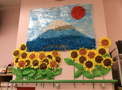 その富士山のふもとに四季折々の、手作りの花を飾っています。この夏、皆様のご協力で、たくさんのひまわりで彩ることができました。