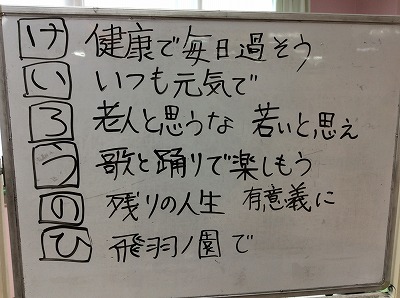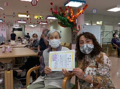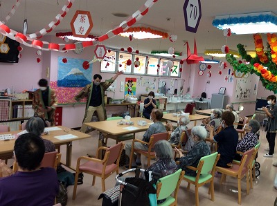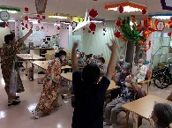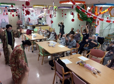 そのあとは、ご利用者様と職員で踊る『ソーラン節体操』です。日頃から、こつこつ練習を重ねていざ本番!実は、職員が立って踊ることは内緒にしていました。職員がハッピを着て登場すると『おぉー!』『かっこいい』と歓声を頂きました。連日アンコールを頂き、デイサービスの皆様が一体となって「どっこいしょ!どっこいしょ!」大賑わいでした。ご利用者様からは、「またやってねー」や「普段の体操で踊ろうよ」などと声を頂きました。
