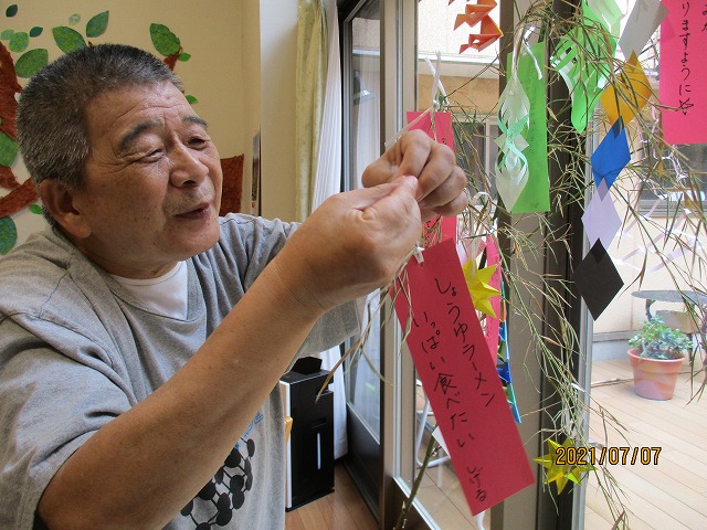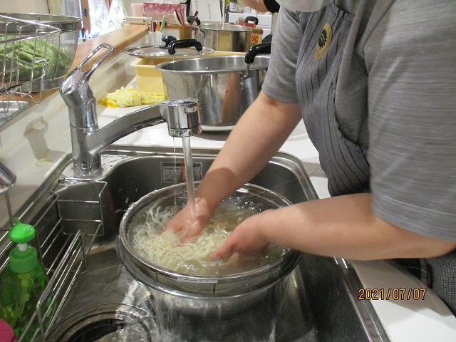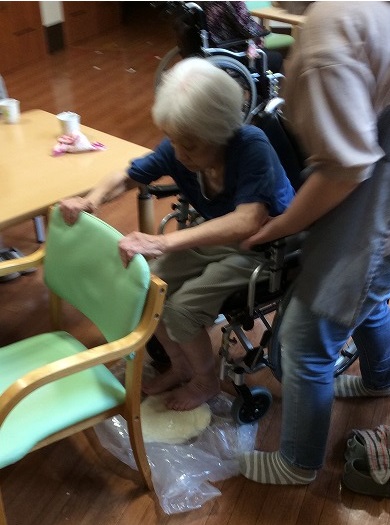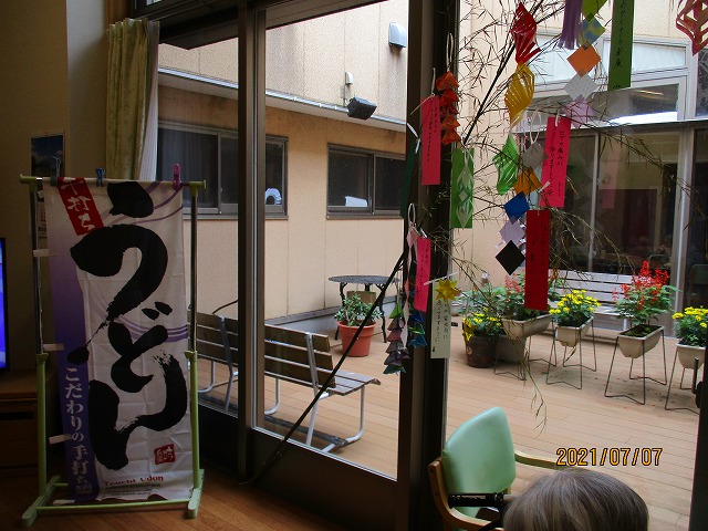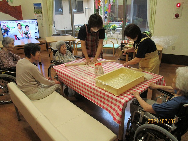 入居者様の希望で、わかくさユニットでは、七夕うどんを手打ちで作りました。本格的に粉から作り、入居者様と職員で力を合わせて踏みました。こしがあり、のどごしの良い美味しいうどんが出来上がりました。「うまっ!」「おいしい」と感想があり、普段は介助を行っている方も、自分で召し上がっていました👍