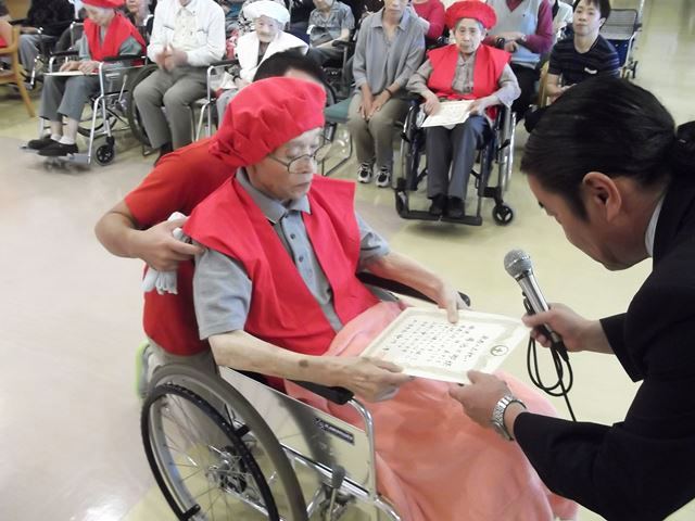 今年の敬老会は、これまでと趣向を変えて実施しました。今年4月の20床増床に伴い、ご入居者の人数が増えたことに伴い、式典後のお食事会を各ユニットでご家族様とゆっくり召し上がっていただくことにしました。