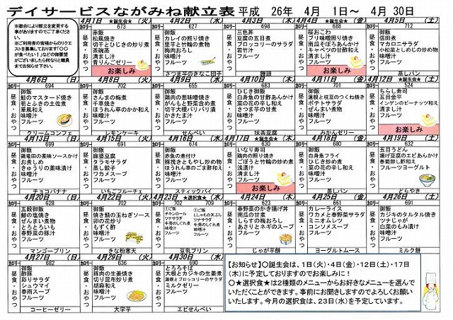 | 12:00~ | 昼食・喫茶コーナー開始(栄養士が作成したカロリーが記入された献立表を毎月お渡しします。 |