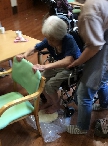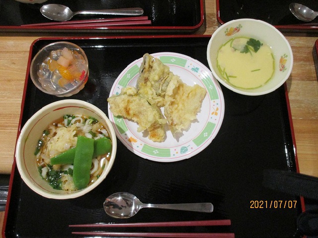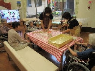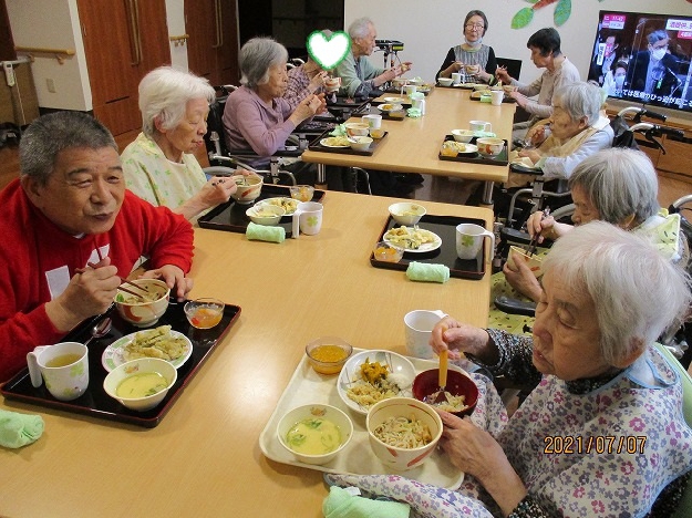 入居者様の希望で、わかくさユニットでは、七夕うどんを手打ちで作りました。本格的に粉から作り、入居者様と職員で力を合わせて踏みました。こしがあり、のどごしの良い美味しいうどんが出来上がりました。「うまっ!」「おいしい」と感想があり、普段は介助を行っている方も、自分で召し上がっていました👍