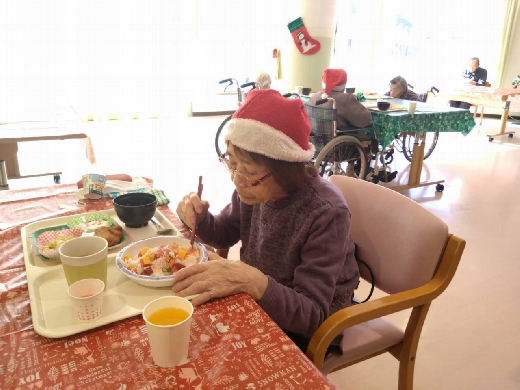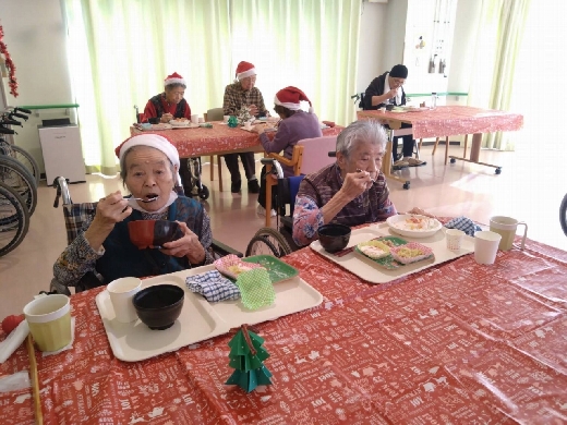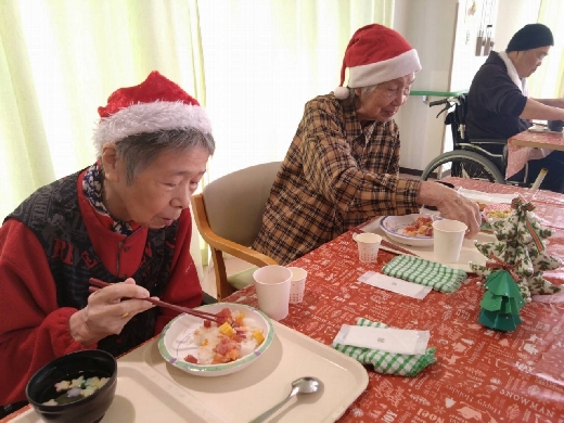 飛羽ノ園ではクリスマスランチをご利用者様に振舞いました。 なぜちらし寿司なのかというと… お刺身やお寿司などは普段の食事では提供がなかなかできず、この機会に喜んで頂きたいと思ったしだいです。 ご利用者様には喜んでいただきました。