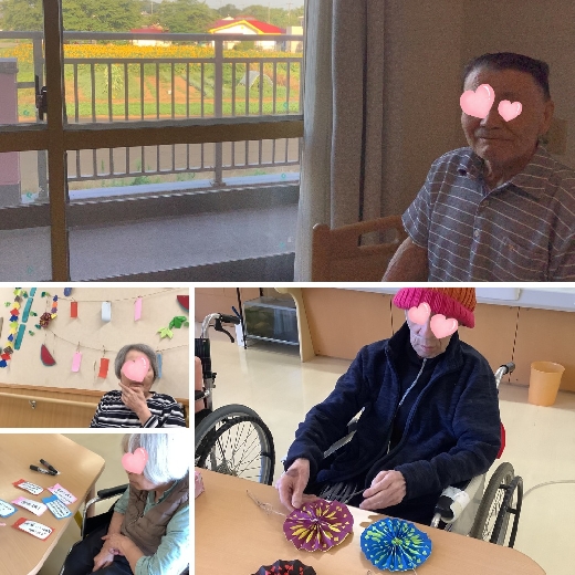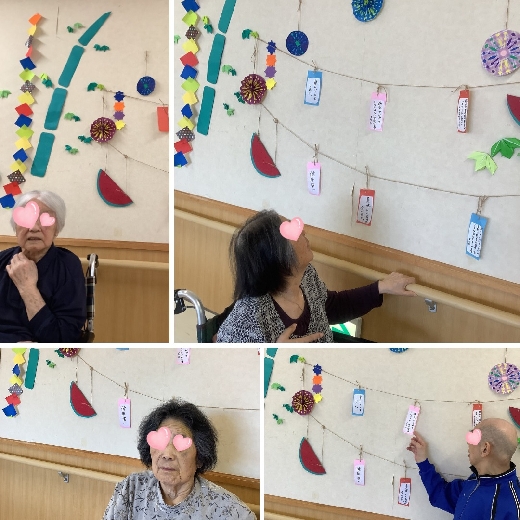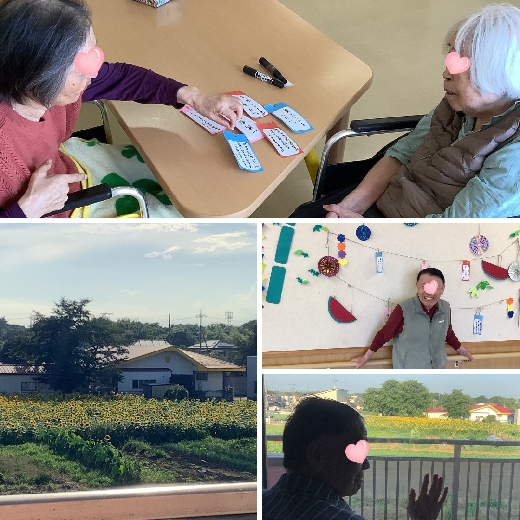 こんにちは、憩いの里ひまわりユニットです。 憩いの里の近くにひまわり畑があり、とても綺麗です。入居者様からのお部屋からも満開の様子を眺めることができます。 ちなみに、七夕飾りも綺麗でしたので、この機会に一緒にご紹介します。