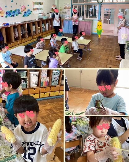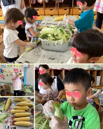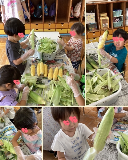 こんにちは、千鳥ケ丘保育園です。 ひばり組さんで夏らしい食育活動しました。 夏野菜「とうもろこし」の皮むきです。 とうもろこしの「ひげ」の数はとうもろこしの「つぶ」の数と一緒だそうです🌽