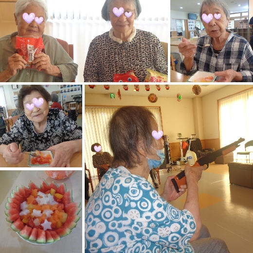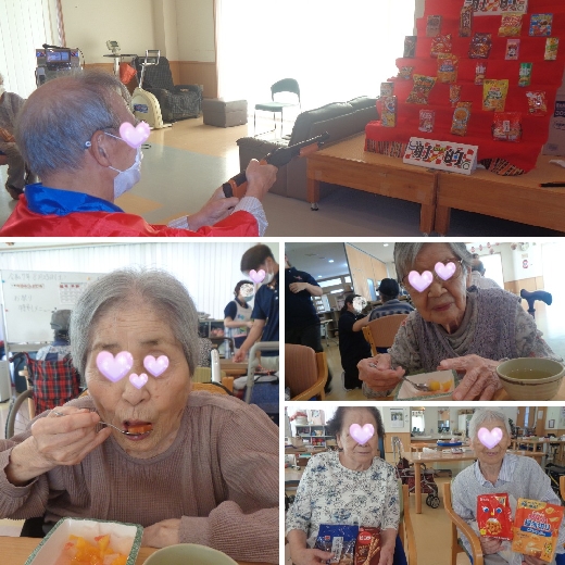 太鼓や鈴の音に合わせて踊る姿に、つい微笑みながら手拍子をして見てしまいます。「昔は地元のお祭りに行っていたわ」と昔話に花を咲かせながら楽しんでおられる姿がたくさん見られました。お囃子の音でテンション高めに過ごしていたことは言うまでもありません♬お囃子の後は皆さんお楽しみの射的です!!