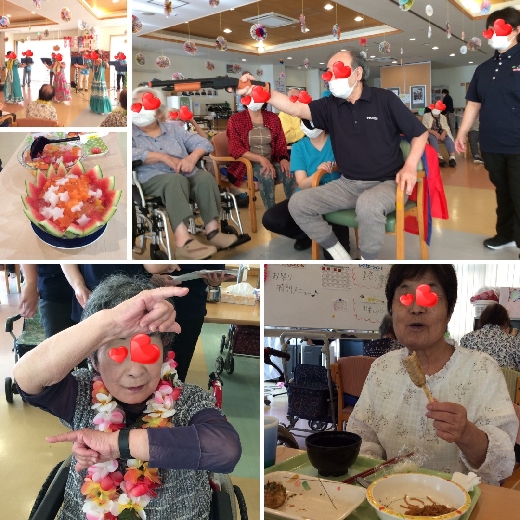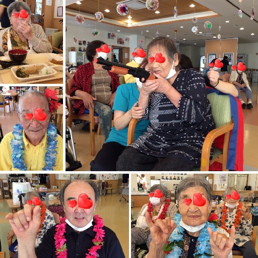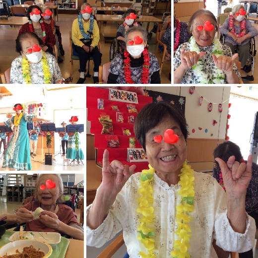 2日目のお祭りでは『都和ウクレレサークル』の皆様がフラダンスやウクレレの演奏を披露するために来てくださいました。憩いの里の利用者様もただ待っているだけでなく、飾りつけをハワイアン仕様にしたり各々がレイをつけてボランティア様を待っていました。そのためウクレレの演奏が始まると「あれっ?ハワイに来た!?」と思ってしまうような雰囲気で楽しむことが出来ました。フラダンスの時はつい腕が動いてしまう方もちらほら…やっぱりハワイはいいですね(^^♪