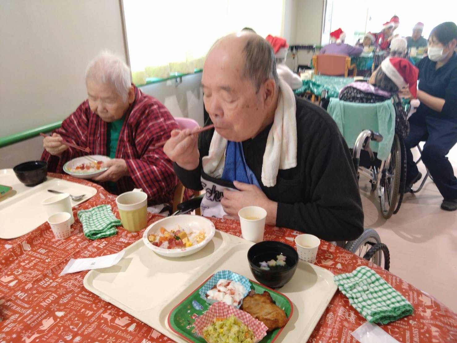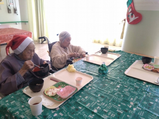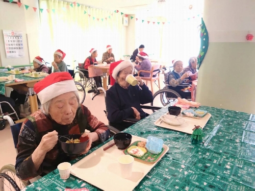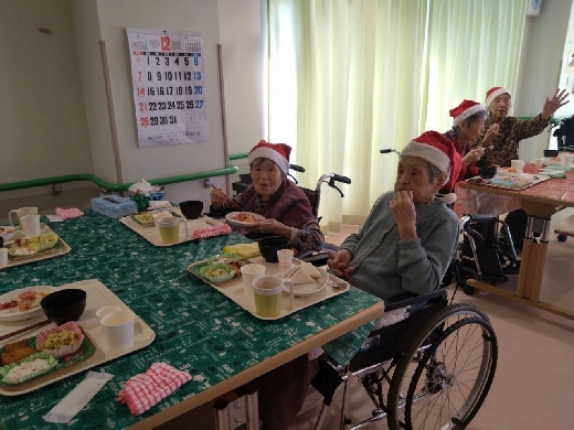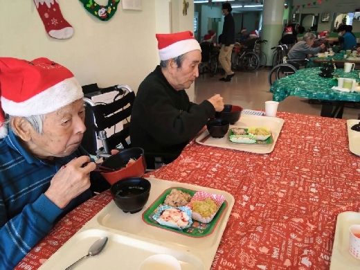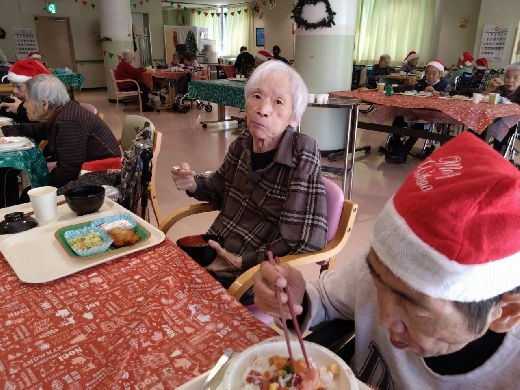 飛羽ノ園ではクリスマスランチをご利用者様に振舞いました。 なぜちらし寿司なのかというと… お刺身やお寿司などは普段の食事では提供がなかなかできず、この機会に喜んで頂きたいと思ったしだいです。 ご利用者様には喜んでいただきました。