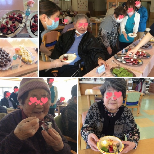 いつもと違う雰囲気で笑顔いっぱいのご利用者様(*^-^*) 私たち職員もつられて笑顔になってしまいます。おなかも気持ちも大満足のケーキバイキングとなりました。