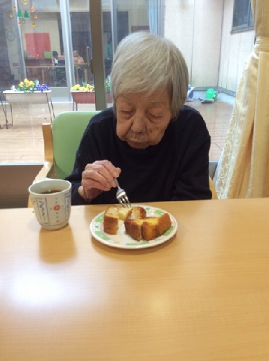 こんにちは飛羽ノ園・とわです🍞 パンが余っていたので、この日はフレンチトーストをキッチンで焼いて食べました。 入居者の皆様、喜んで食べて頂けたと思います(笑)